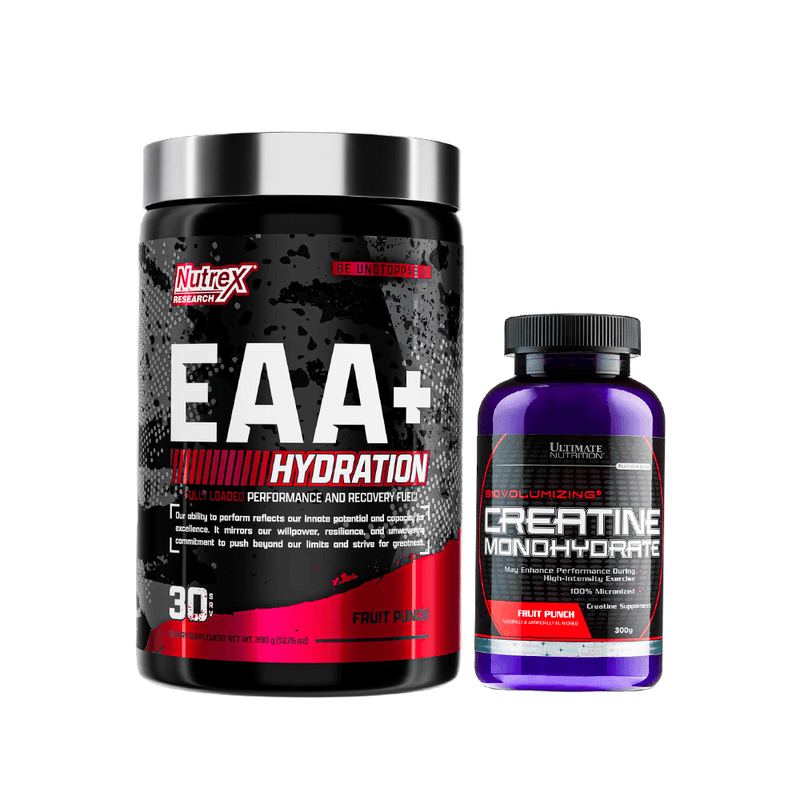 PACK EAA HYDRATION 304.2G NUTREX + CREATINA FRUIT PUNCH 300G apoya el mantenimiento y desarrollo muscular, reduce la fatiga y optimiza la recuperación post entrenamiento.