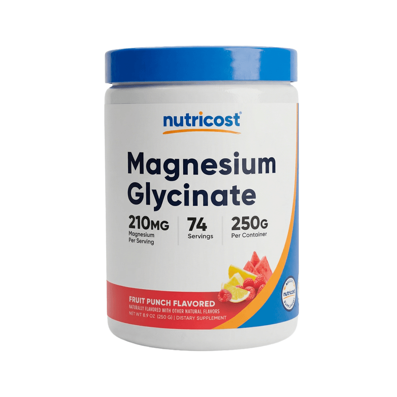 Glicinato de Magnesio 250g sabor fruit punch con 210 mg de magnesio por porción. Alta absorción y buena tolerancia digestiva. Apoya la función muscular y nerviosa. Sin GMO, apto para vegetarianos y libre de gluten.