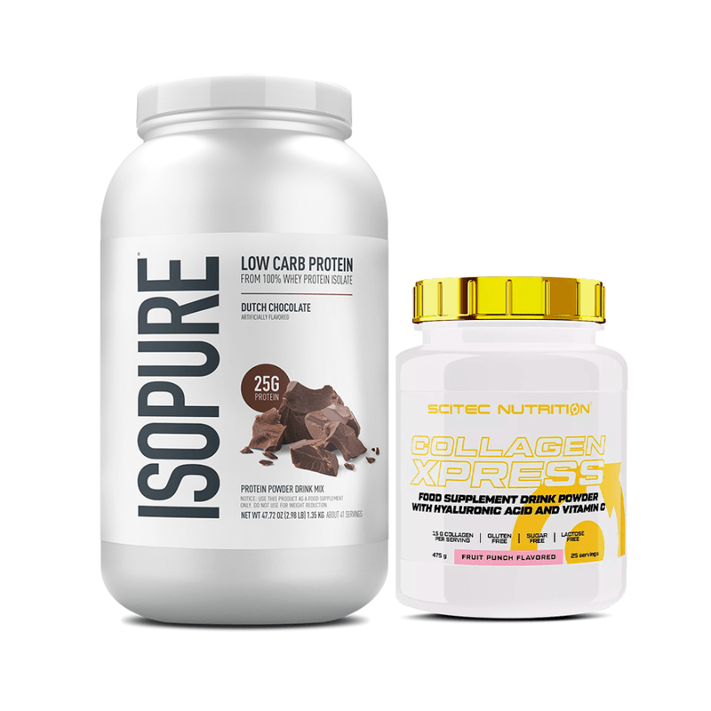 Isopure Zero/Low Carb 3 lb + Colágeno + Ácido Hialurónico 475g. Proteína aislada 100% sin carbohidratos ni grasas para definición muscular y recuperación rápida. Combinado con colágeno hidrolizado y ácido hialurónico para fortalecer articulaciones, mejorar elasticidad de la piel y cuidar cabello y uñas. Ideal para definición extrema y cuidado integral del cuerpo.