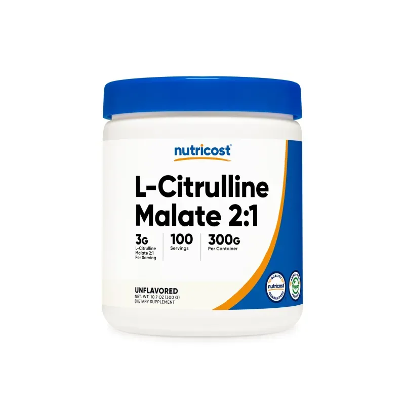 L-Citrulline Malate 300g de Nutricost para potenciar tu pre-entreno. Mejora flujo sanguíneo, bombeo y resistencia. Libre de gluten, sin GMO y apto para veganos.