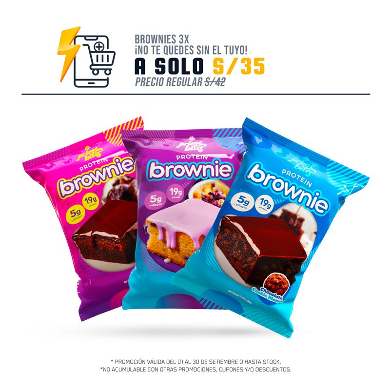 ✔ Brownie proteico listo para comer, bajo en azúcar y alto en fibra.